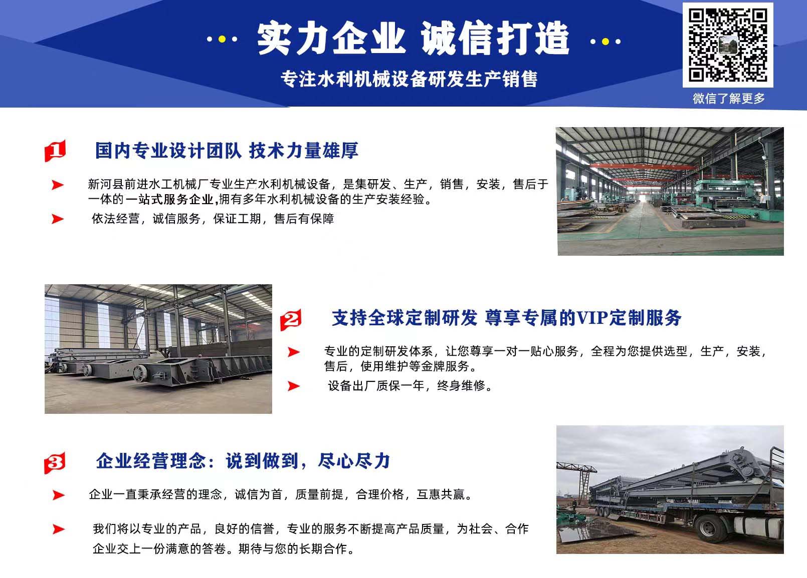 新河縣前進(jìn)水工機(jī)械廠是一家專門從事水利工程設(shè)備研發(fā)生產(chǎn)的廠家,現(xiàn)有員工228人,各類高、中級(jí)專業(yè)工程技術(shù)人員近30人,技術(shù)生產(chǎn)工人180多人。公司占地面積14674平方米。公司擁有車、鉗、刨、銑、冷作、鈑金、鑄造等,工種齊全,加工能力和技術(shù)力量雄厚,并具備理化測(cè)試手段與儀器設(shè)備。前進(jìn)水工專注景觀閘門,鋼壩,合頁壩,液壓升降壩,液壓閘門,臥倒門,一字門,人字門,液壓?jiǎn)㈤]機(jī),卷揚(yáng)啟閉機(jī),螺桿啟閉機(jī),清污機(jī),除污機(jī),閘門,拍門等設(shè)備的研發(fā)與生產(chǎn),是新河水利工程產(chǎn)品行業(yè)的領(lǐng)跑者,不僅在同行業(yè)群中揭起了一次又一次的技術(shù)革新,更為水利工程企業(yè)提供了更高更大的選擇平臺(tái)。 選擇前進(jìn),我們與您一起向前邁進(jìn)。 前進(jìn)水工優(yōu)勢(shì):具有專業(yè)研發(fā)團(tuán)隊(duì),精湛的制造工藝,嚴(yán)謹(jǐn)?shù)臋z驗(yàn)技術(shù),完善的售后服務(wù) 企業(yè)理念:說到做到,盡心盡力   ……[+詳情>>]